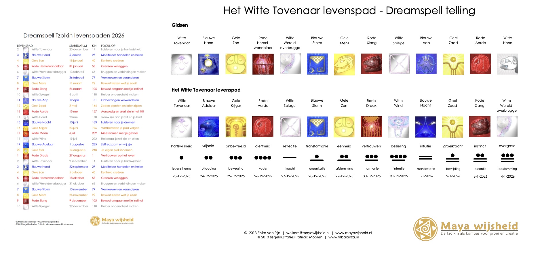 Een kalenderoverzicht op 1 A4 van alle 29 levenspaden in 2026 met de startdatum, bijbehorend Kin getal en focus per levenspad.